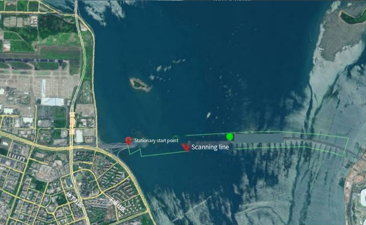 Using map software to plan the scanning route, the ship starts at a fixed position, and the scanner locates in real-time through RTK to ensure data accuracy.
